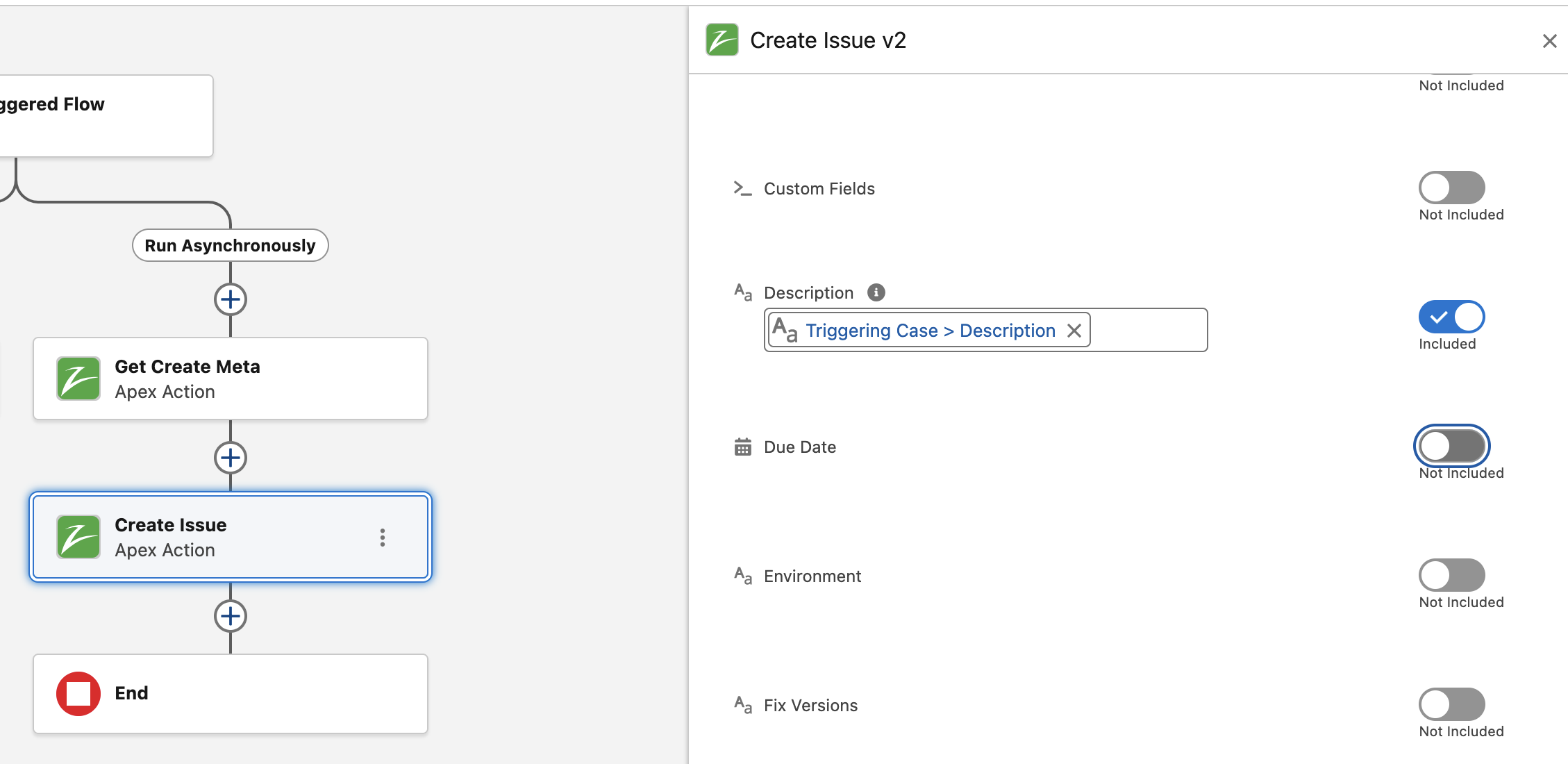 You can create an Issue by using Salesforce Flow and adding the “Create Issue v2“ action to your flow. The action has the following fields: