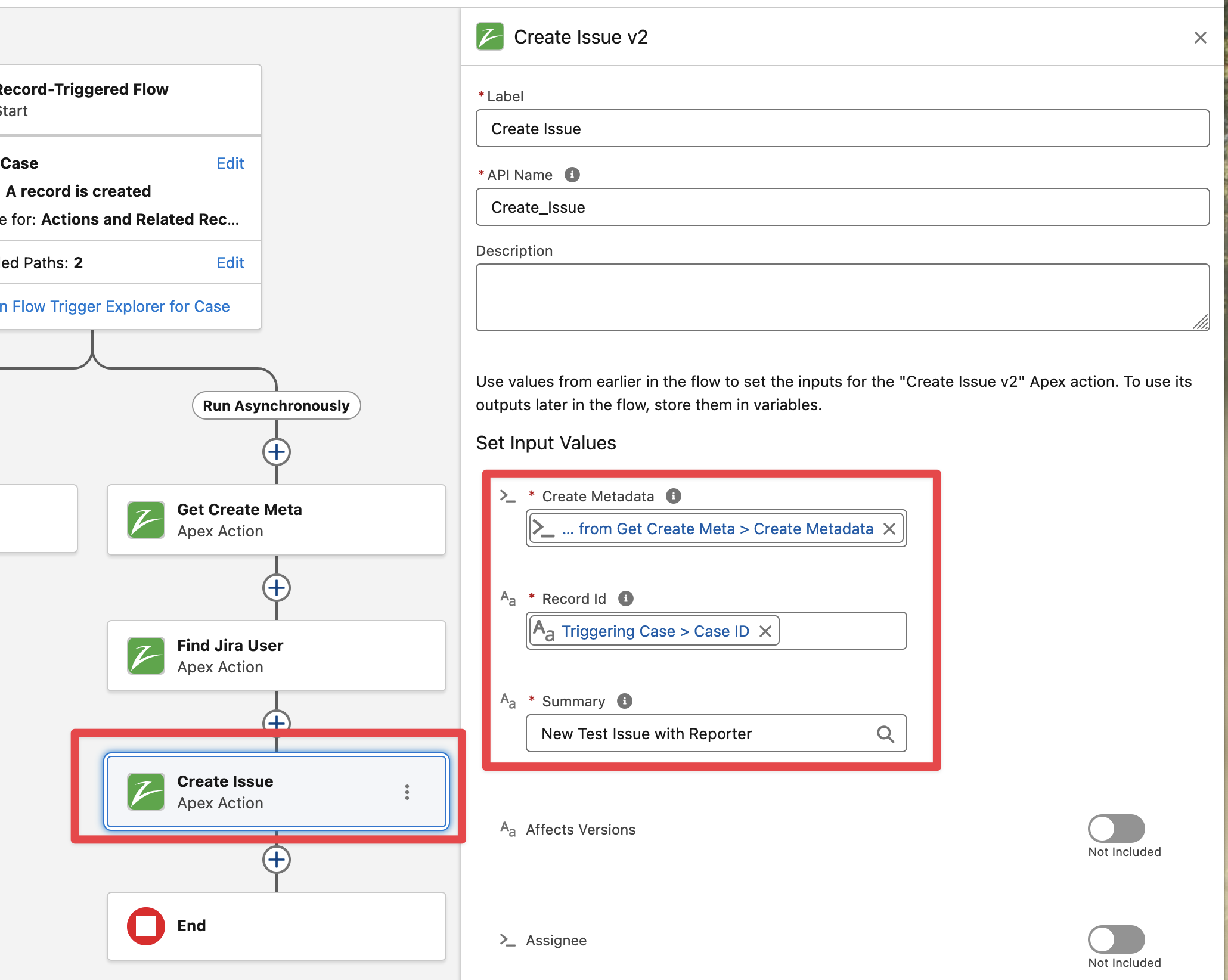Example Flow to Create an Issue in Jira when Case is created and set reporter as the current User.
