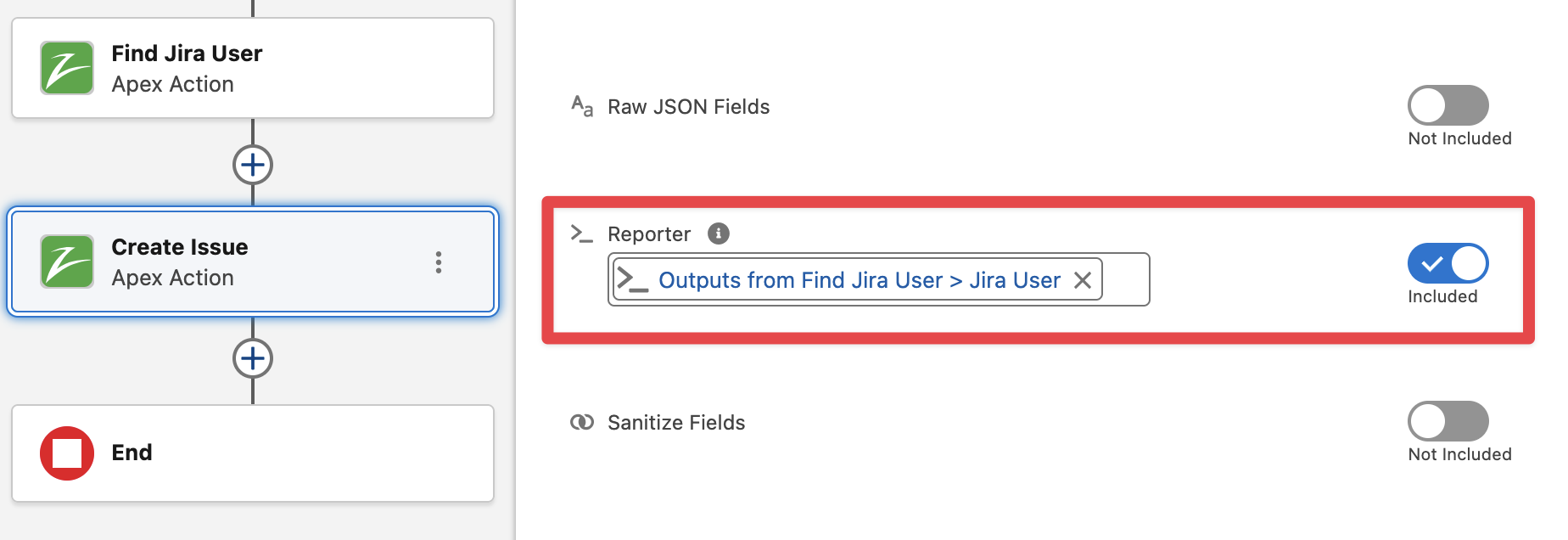 Include the “Reporter“ field passing the output of the action Find Jira User > Jira User