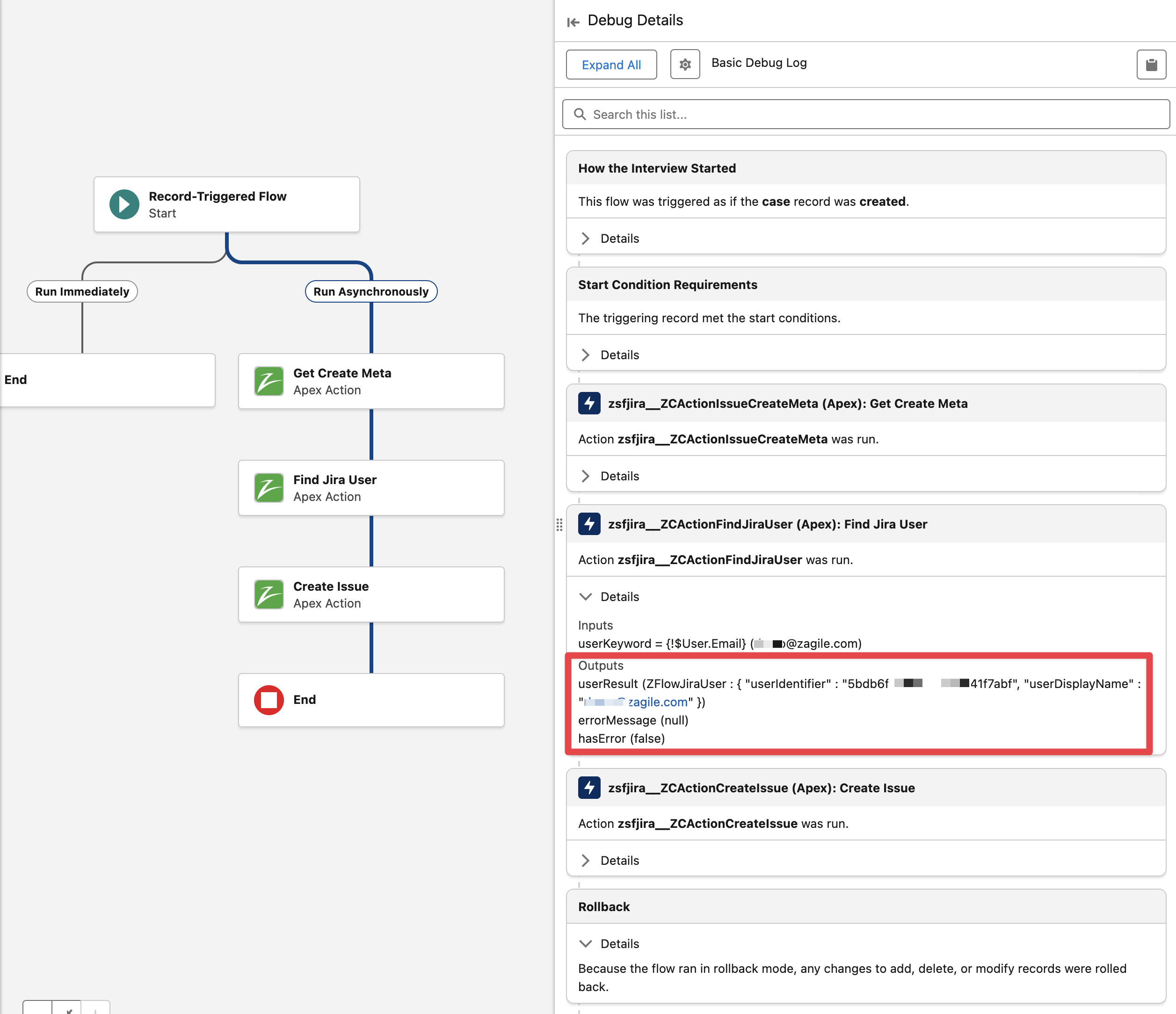 The following screenshot shows the execution of the Flow in Debug mode, note that there is a result in the output of the Find Jira users action.